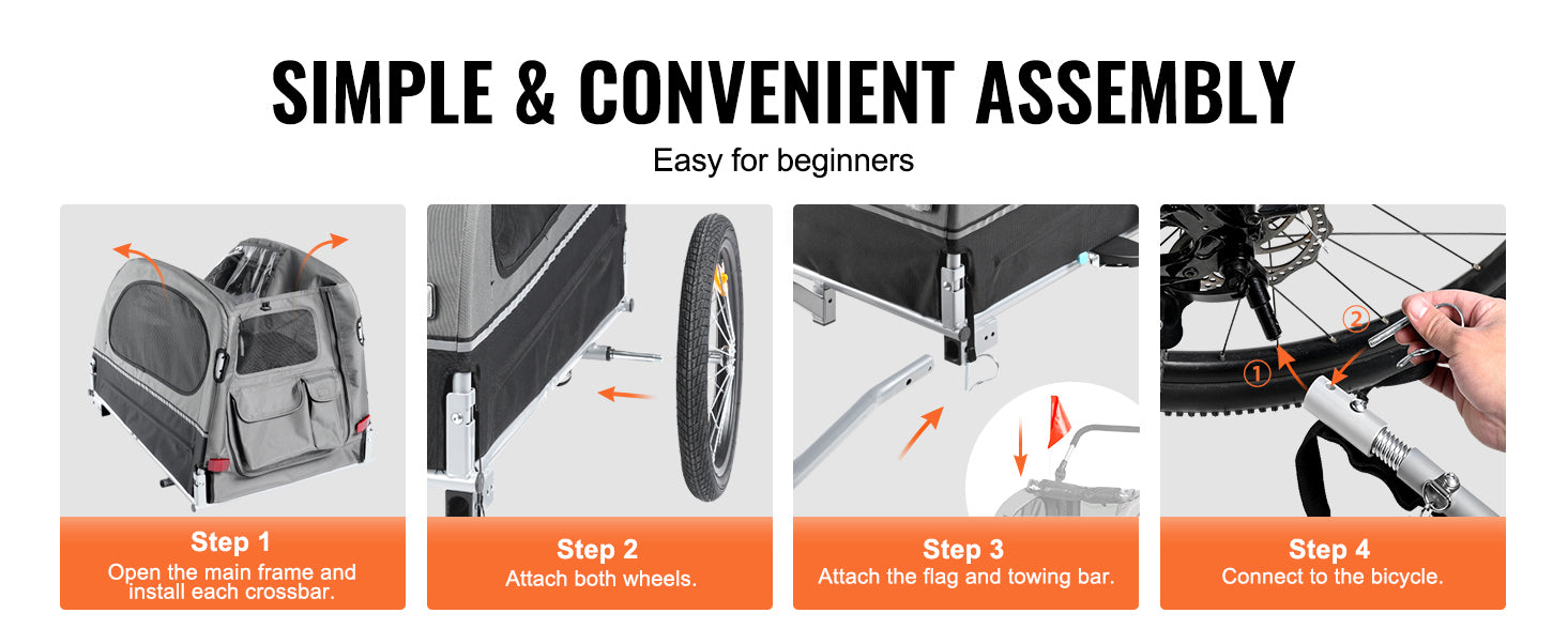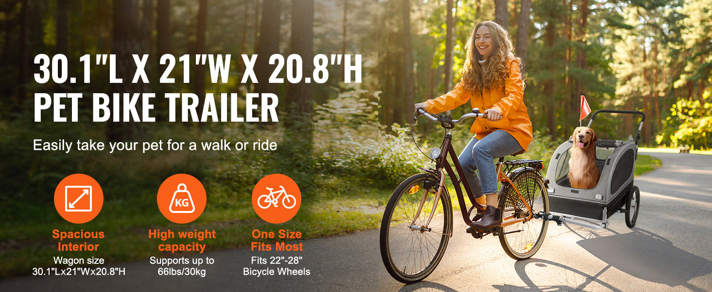 The easy-fold frame allows quick storage and transport, while the large wheels ensure a smooth ride on various terrains. Equipped with reflectors for improved visibility, ventilation panels, and a secure bicycle coupler, this trailer offers both comfort and safety during walks, runs, or bike rides.